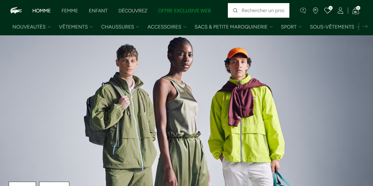 - קונים כמו מקומיים: מבקרים בחנות האונליין של לקוסט במדינה הנבחרת (למשל Lacoste USA), גולשים במבחר הרחב של ביגוד, הנעלה ואקססוריז ומוסיפים פריטים לעגלת הקניות.